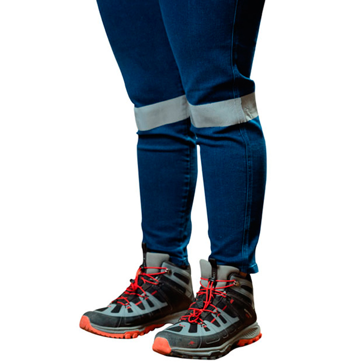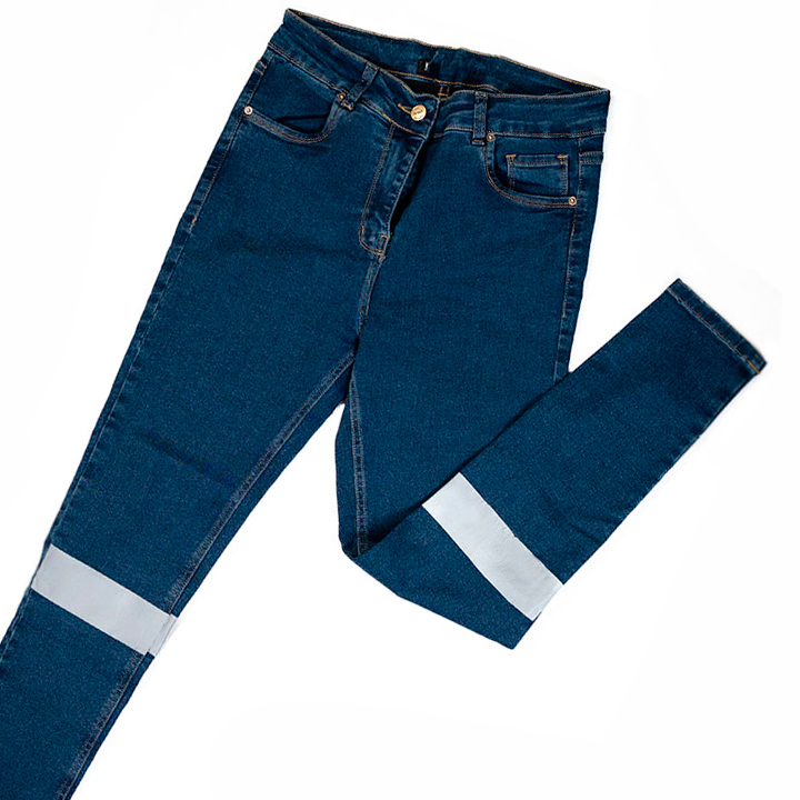 Bandas reflectivas de calidad, cosidas o termo fisión en las botamangas (aprox. 30 cm para arriba desde el ruedo) de 2,5 cm de ancho.