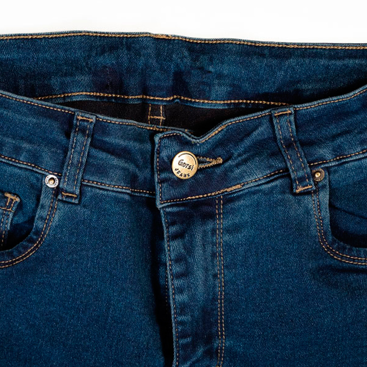 Corte clásico y elastizado (pegado al cuerpo). Calce exclusivo de dama con bolsillos tanto en la parte delantera como trasera, con botones y cierre metálicos. Confección femenina tiro medio. De 12 onzas, 100% algodón con tratamiento prelavado.